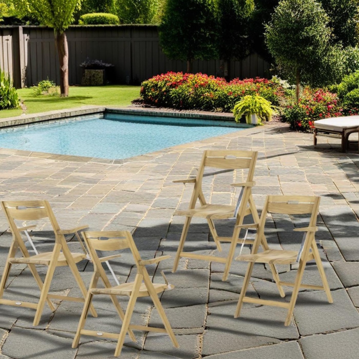 Clean lines, welcoming curves, and the organic feel to the touch of its smooth rounded edges give the Surf Folding Dining Chair Set of 4 its immediate appeal. First impressions hardly reveal that the exceptionally comfortable chair folds effortlessly. Though visually robust and generously scaled, it is relatively lightweight yet structurally strong given its solid teak stature, allowing this chair to endure the test of time and the outdoors. With a graceful stance and statuesque silhouette, the Surf folding chair will fit beautifully anywhere: on a super yacht, at a dining table, on a sun-drenched terrace, or extra seating when needed... wherever, whenever.