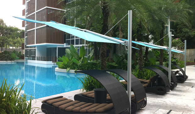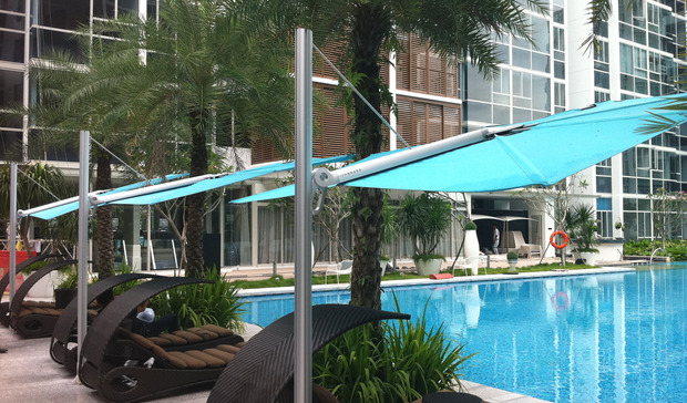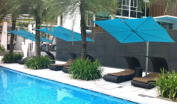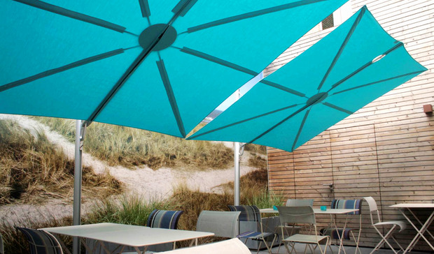 The Spectra is a well-planned marriage of contemporary beauty and functionality. This sleek umbrella design offers a beautifully designed anodized aluminum post and a flat canopy which reduces wind drag with a unique geometric character. Ergonomic and simple to operate (see video below), place the Spectra into any tilt level (i.e. adjusting the shade accordingly) by simply moving the elegantly styled handle up and down the track of the streamlined pole. Also available is the 100 degree forward leaning post allowing the versatility of use for tables without umbrella holes or with any style lounging furniture outdoors.