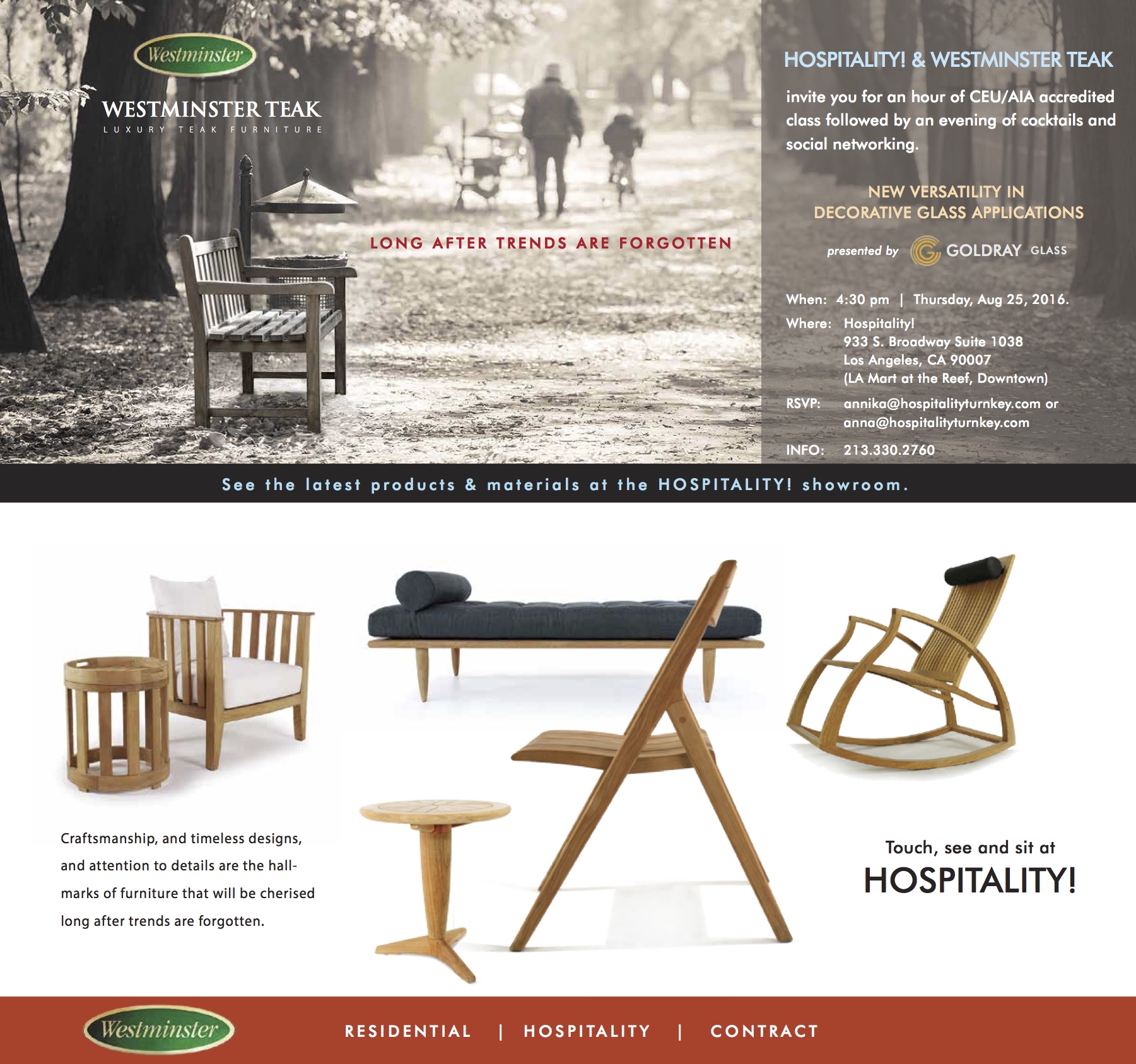 Interior designers and architects are cordially invited to attend a CEU/AIA class at the Hospitality! showroom located in LA Mart on August 25th, 2016 at 4:30 PM, followed by a highly anticipated social networking event from 6-9 PM. The latest products and materials from 20+ vendors will be on display, including Westminster Teak.