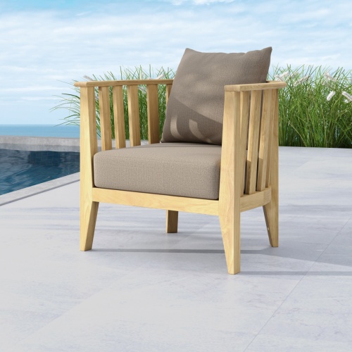 With its welcoming shape, elegant slats, and the warmth of premium teak, the Kafelonia Club Chair is difficult to resist. Deep, plush seat and back cushions on generously proportioned frame allows "unrestricted movement" for comfort in seating over extended periods of time. Lavish use of premium teak in the frame of the furniture ensures maximum structural strength while providing warmth and beauty in any space. The pure forms and modern simplicity of each piece in the collection is a true reflection in timelessness. Part of the Kafelonia collection.