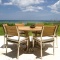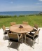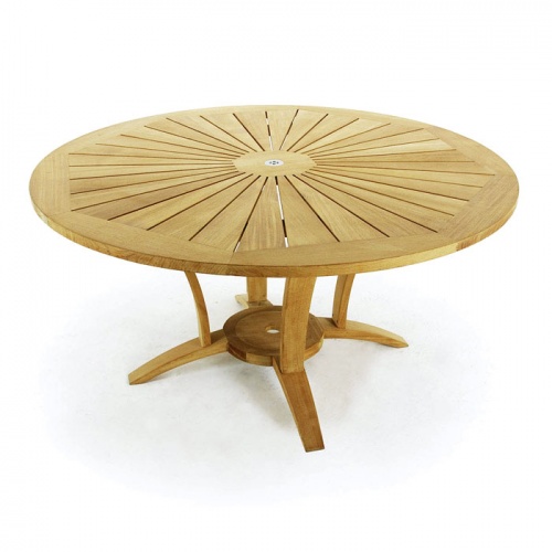 The strikingly unique starburst table top design of this magnificent 5ft round teak dining table, redefines casual outdoor living. With its distinct graceful arched legs, each cut from a solid piece of un-laminated teak lumber, this all solid teak dining table will be as at home inside as it would outside. The 60 inch diameter teak dining table comfortably accommodates seating for 6. The table top is designed to accept a 2 inch diameter umbrella pole. The Venezia Round Table matches all standard height Westminster Teak Dining Chairs: fixed and folding, teak or teak and stainless steel.