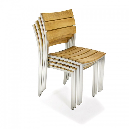 Utilizing two of the most durable materials for outdoor use, the Venezia outdoor stacking chair leverages on the beauty, strength, and durability of both teak and stainless steel components. The wide slats of its back rest and gently scooped seats provide extraordinarily comfortable seating, even without cushions! Beautifully crafted and hand sanded to a micro-smooth finish, these handsome chairs will fit nicely indoors in a contemporary kitchen or casual dining area. Chairs stack four high for easy storage. The Venezia outdoor stacking chair is made from premium eco-friendly grade A teak from renewable plantations.