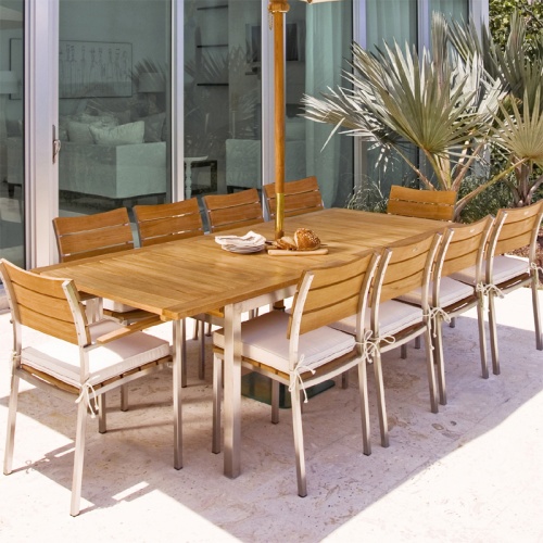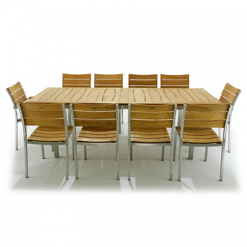 Venezia 's Grand Dining set epitomizes casual outdoor luxury in contemporary dining. Well proportioned and extraordinarily comfortable, the Venezia dining chair and armchairs complement beautifully with its teak and brushed stainless steel extendable table. Set comfortably seats up to10 diners when fully extended. The whimsical scalloped design of the table top also accommodates a 2" diameter umbrella pole. Chairs stack four high for easy storage. The Venezia Grand Dining Set includes: 1 extension table, 2 armchairs and 8 dining chairs.