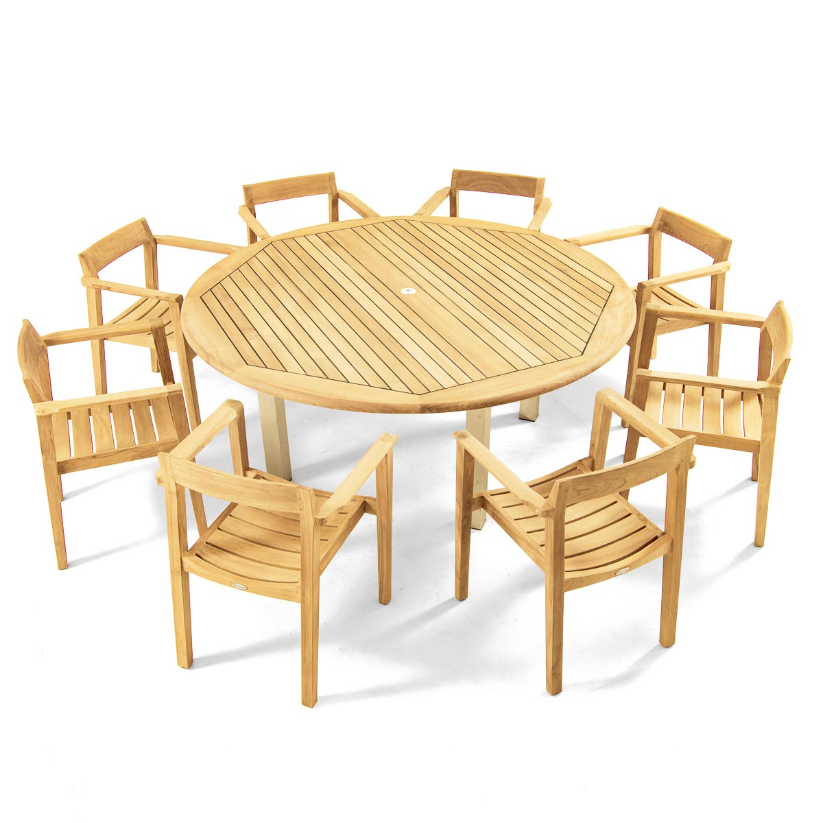 With the interplay of teak and stainless steel in the Vogue Table and the Horizon Chairs clean lines, the Horizon Vogue Set for 8 exemplifies traditional craftsmanship meeting modern design. The Vogue Table's use of stainless steel and Sikaflex (a high-grade polyurethane sealant in the tabletop slats) provides a nautical appeal, unexpectedly complementing the hints of Danish modern design of the Horizon Chairs. Crafted with the use of two classic outdoor materials, this set will endure the test of time and the outdoors.