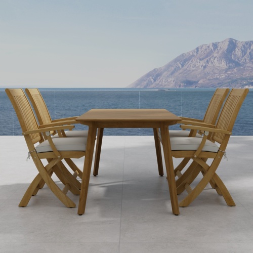With both traditional and modern appeals, the Barbuda & Surf 5 piece Dining Set is defined by convenience and versatility. First impressions hardly reveal that the Barbuda Chairs fold effortlessly, resulting in an organic and exceptionally comfortable chair. Though lightweight, the Barbuda Dining Chair is visually robust and structurally strong given its solid stature. Drawing inspiration from Scandinavian architecture, the arbitrary yet clean lines of the Surf Rectangular Table lend it a light and airy appearance. Its irresistibly smooth tabletop allows it to be an excellent choice for the indoors, though it is more than robust to endure the test of time and the outdoors. Angled legs add stability while giving the impression of spaciousness.