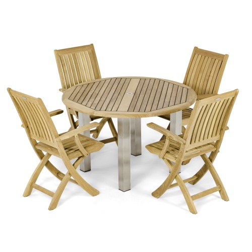 Pairing traditional and contemporary designs, the Vogue Barbuda 5 piece set is defined by the stunning contrasts of refreshing stainless steel and the warmth of micro-smooth teak. The ergonomic design in the backrest and seat of the Barbuda Folding Armchairs offers lasting comfort and can be folded for easy storage. The teak and stainless steel in the Vogue Round Table combines impeccable strength of two classic outdoor materials, all pieces endure the test of time and the outdoors.